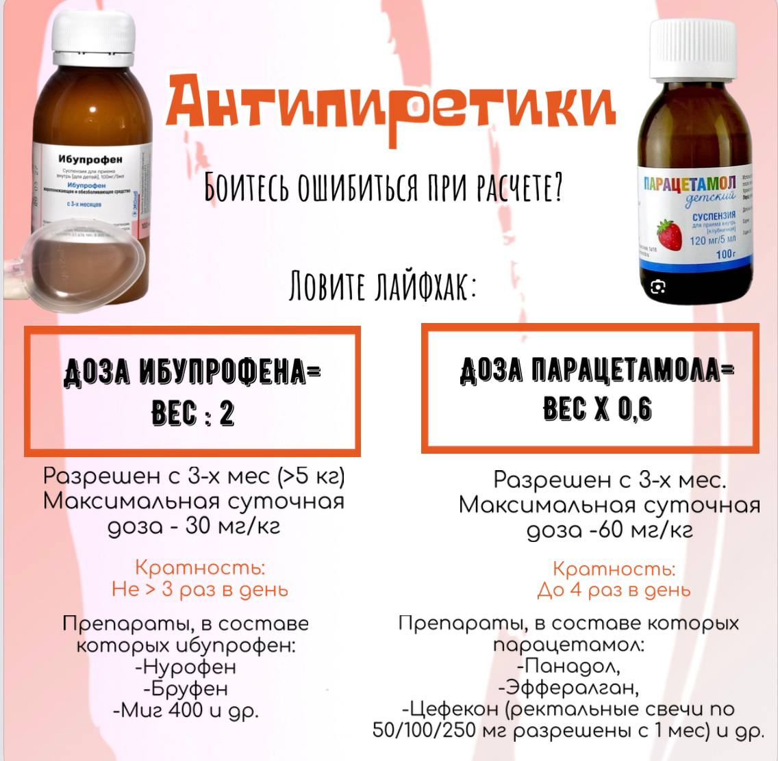 - Используйте только парацетамол ИЛИ ибупрофен (суспензия, свечи, с 3-х лет можно таблетки) не чаще, чем каждые 4-6 часов